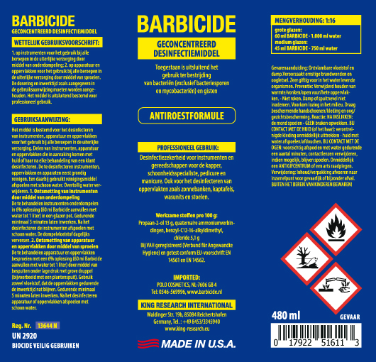 - Let Op: Barbicide is een bij het Ctgb – College voor toelating gewassen en biociden – geregistreerd desinfectiemiddel onder nummer 13644N. Dit is in Nederland verplicht en zonder dit nummer mag Barbicide niet in Nederland verkocht worden