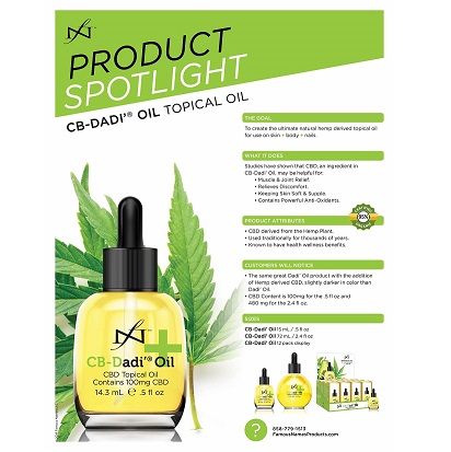 Dadi’ Oil is een verzorgende nagelolie die gemaakt is om flexibiliteit, stevigheid en glans te geven aan de naturlijke nagel, aan nagelprodcuten en aan de nagelriem! Dadi’ Oil wordt snel opgenomen en is niet vet. Het brengt drie gecertificeerde organische olieën samen. Een gecertificeerde organische olie is een hoogwaardig product afkomstig van boeren die duurzame technieken hanteren en geen kunstmatige mest of bestrijdingsmiddelen gebruiken. Avocado, Olijf en Jojoba olieën werken samen om te beschermen, te hydrateren en te verzachten. Er is Naturlijke Vitamine E (niet synthetische tocopheryl acetaat) toegevoegd, een krachtige anti-oxident. Dit mengsel van 21 essentiele oliën heeft een aangename geur.