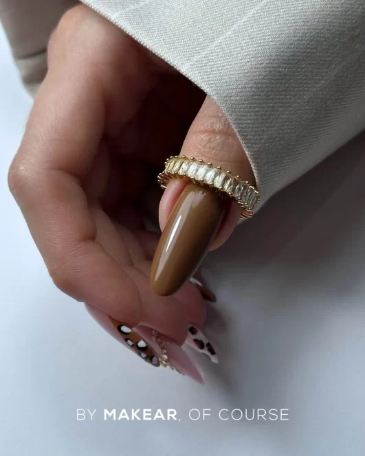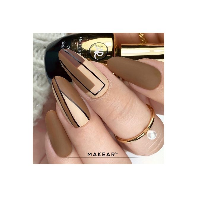 Het laat perfect de herfstmanicuretrends zien. Je gevoel wordt wakker gemaakt door een combinatie van chocoladebruin, pistachelatte met kardemomon, karamel met noten en hete kaneelcacao deze herfst. Het zorgt ervoor dat je je warm, gezellig en stijlvol voelt. Het is de gouden aura van gelnagels gemaakt door MAKEAR. Leer kennis met 10 nieuwe herfstkleuren die ideaal zijn voor sfeervolle, modieuze styling.