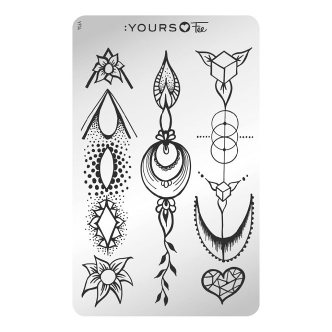 De drie secties van ontwerpen op deze plaat zijn gemaakt met het idee om meerdere nail art-technieken samen te gebruiken. De patronen met een duidelijke ruimte in het midden, omringd door details, werken verbazingwekkend over glittervervagingen, explosies van neonkleur en als een frame voor het maken van 3D-juwelen.